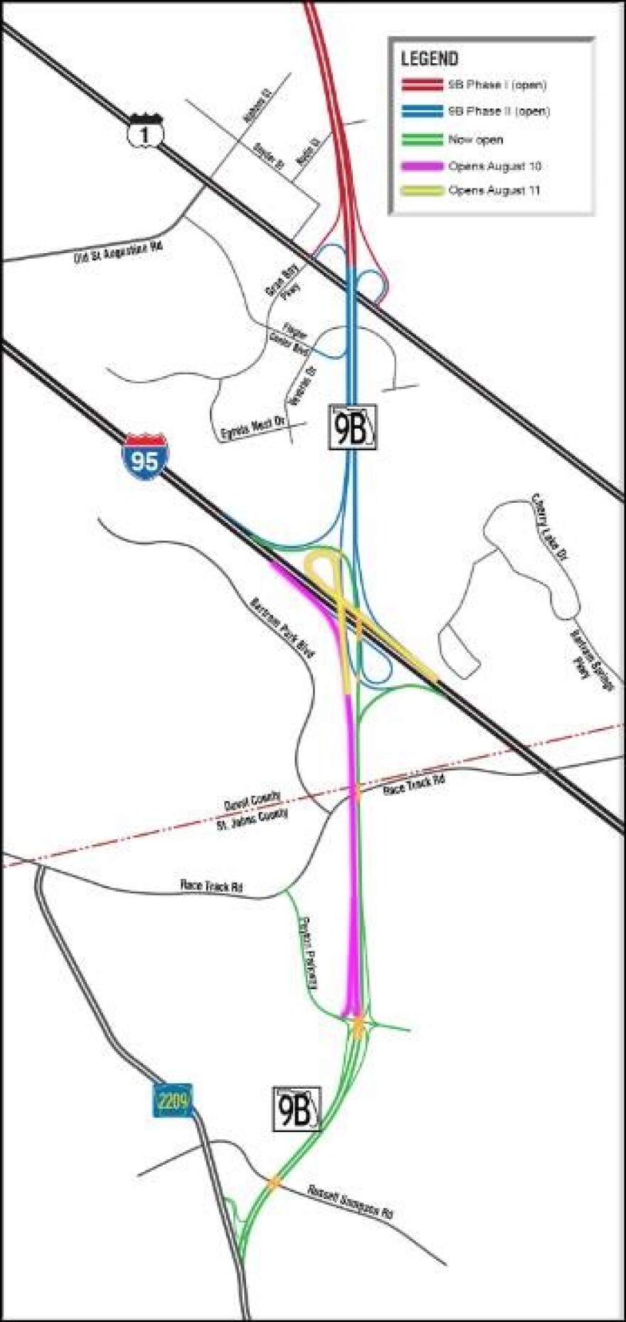 On Wednesday, the northbound lanes opened, as well as the Peyton Parkway exit (Race Track Road Connector) that leads to Racetrack Road (the green on the map to the left), according to our News4Jax news partner.The Florida Department of Transportation opened southbound I-95 to southbound S.R. 9B (the magenta on the map) on Thursday morning -- one day before St. Johns County students head back to class for the first day of school.
