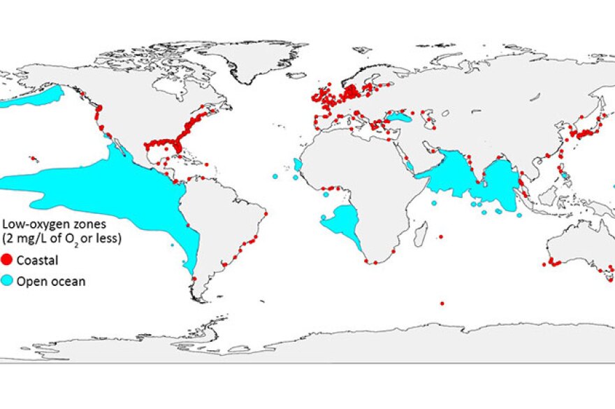 The study found that the amount of water with zero oxygen in the open ocean is up more than fourfold in the last fifty years. And since 1950, low-oxygen sites in coastal waters, including estuaries and seas, have jumped more than tenfold.