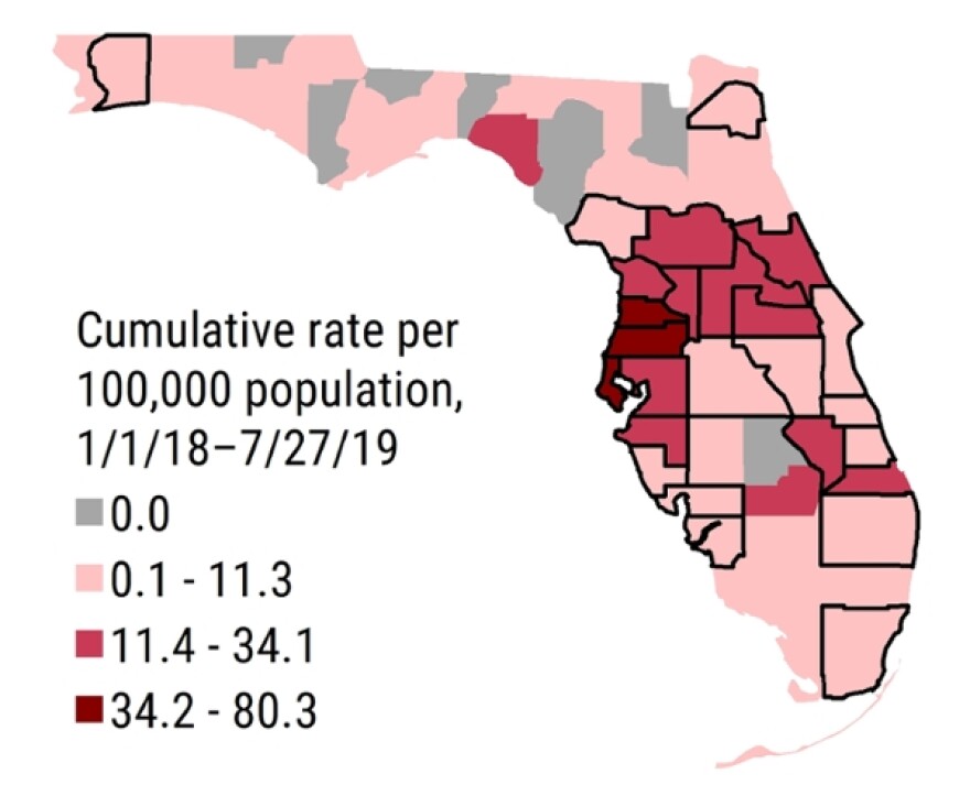 Pasco and Pinellas counties lead the state in the number of reported cases, with 358 in Pasco and 328 in Pinellas, as of Saturday.