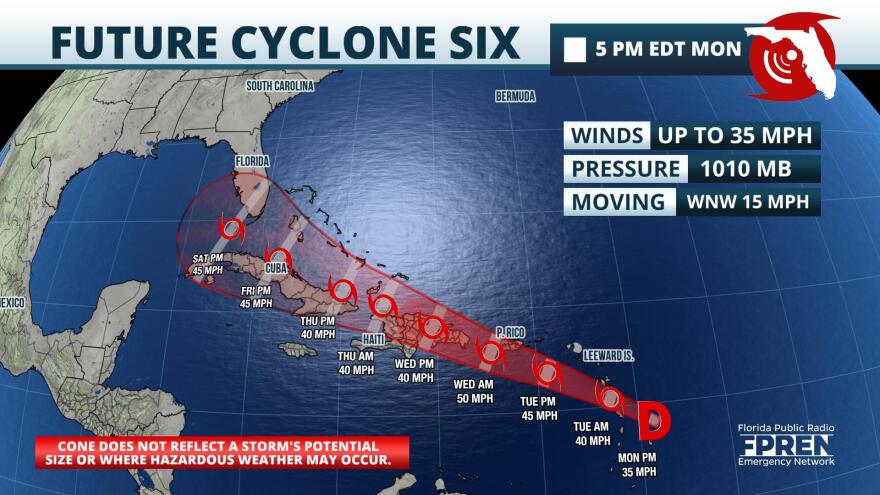 The National Hurricane Center began advisories on Potential Tropical Cyclone Six (PTC Six). The future tropical storm (formerly Invest 94L in the original story below) is expected to move through the Lesser Antilles overnight, then pass by or over the Virgin Islands and Puerto Rico Tuesday. Tropical Storm Watches were issued for Guadeloupe, Martinique, Dominica, the U.S. Virgin Islands, Puerto Rico, and portions of the Dominican Republic. PTC Six is forecast to then move near or just north of Cuba later this week and potentially influence the weather in portions of South Florida by Friday.