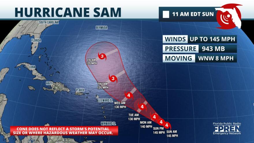 Sam continued to strengthen Saturday afternoon and evening, attaining category 4 intensity on the 5pm Saturday advisory. Sam had top sustained winds of 145 mph as of Sunday morning. Its intensity is forecast to fluctuate, but the Hurricane Center forecast maintains Sam as a major hurricane — category 3 or higher — through the upcoming week.